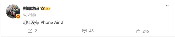 电脑知识网11月12日消息,博主刹那数码爆料,明年没有iPhone Air 2。有网友猜测,iPhone Air 2可能会跟iPhone 18标准版一起在2027年上半年亮相。
