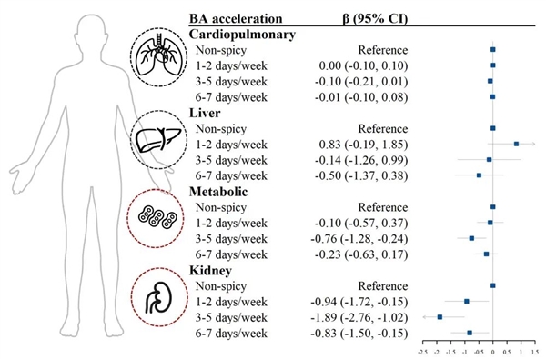 结果相当耐人寻味:与很少或不吃辣的人相比,每周吃辣 3–5 次的人,综合生物学年龄的加速值下降约 0.69 岁;每周 6–7 次的降幅约 0.32 岁,1–2 次下降不显著[1]。