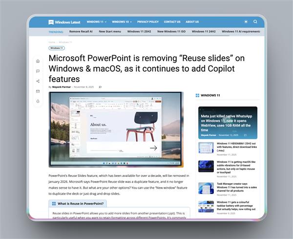 微软近日宣布,将在 2026 年正式移除 PowerPoint 中的“重用幻灯片”功能。这一功能曾帮助职场人从旧文件中快速提取内容、拼接新PPT,被称为“复用神器”。消息一出,不少用户在社交媒体上表示惋惜,认为这是一次对实用工具的收缩。