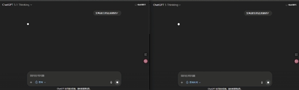 世超试了试,它的效果还挺明显的。在简单的逻辑问题上,左边 5.1 Thinking 的思考速度明显比右边 5 Thinking 要快得多。