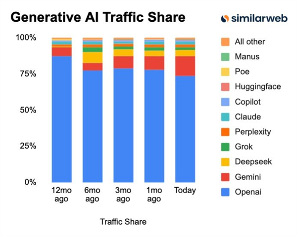 根据 10 月的一篇报告,GPT 在 2025 已经快走了一年的下坡路,市场份额一直在萎缩。虽然抢占先机保住了龙头地位,但 AI 界的竞争依然在残酷进行中。