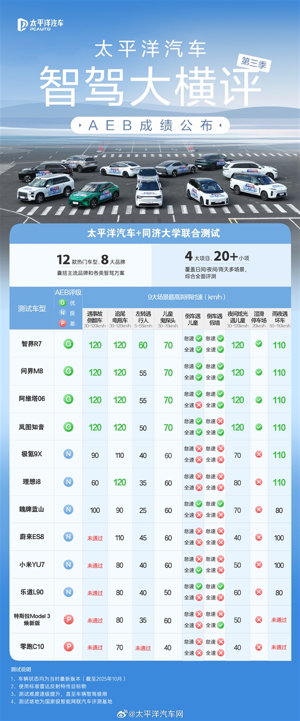 电脑知识网11月14日消息,近期,太平洋汽车网举办了第三季“智驾大横评”,并于今日公布了多车AEB测试成绩。