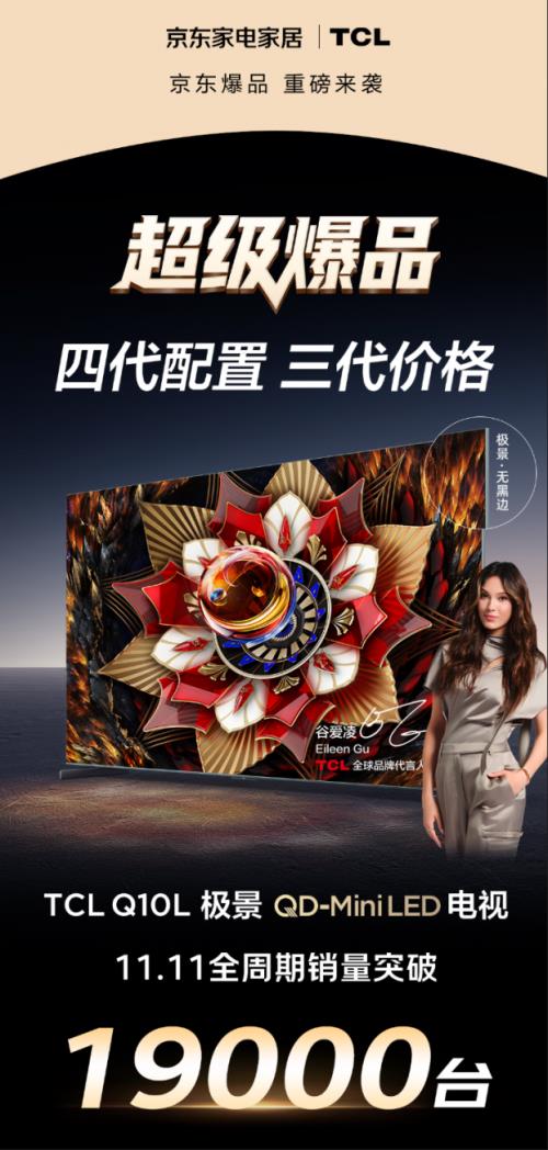 在持续推动行业标准升级与场景创新的同时,京东还积极发挥“超级供应链”效率与品质,携手品牌深化产品合作,以“独家包销”模式打造具有市场爆发力的“超级爆品”。在11.11期间,京东与TCL联合推广的TCL Q10L全面屏无黑边电视,成为这一策略的亮眼成果,该产品以“四代旗舰配置、三代心动价格”实现性能与价格的双重越级,全周期销量突破19000台,高点爆发期更吸引超3800位用户集中下单,好评率高达100%,充分印证了市场对京东主推高端产品的高度认可。