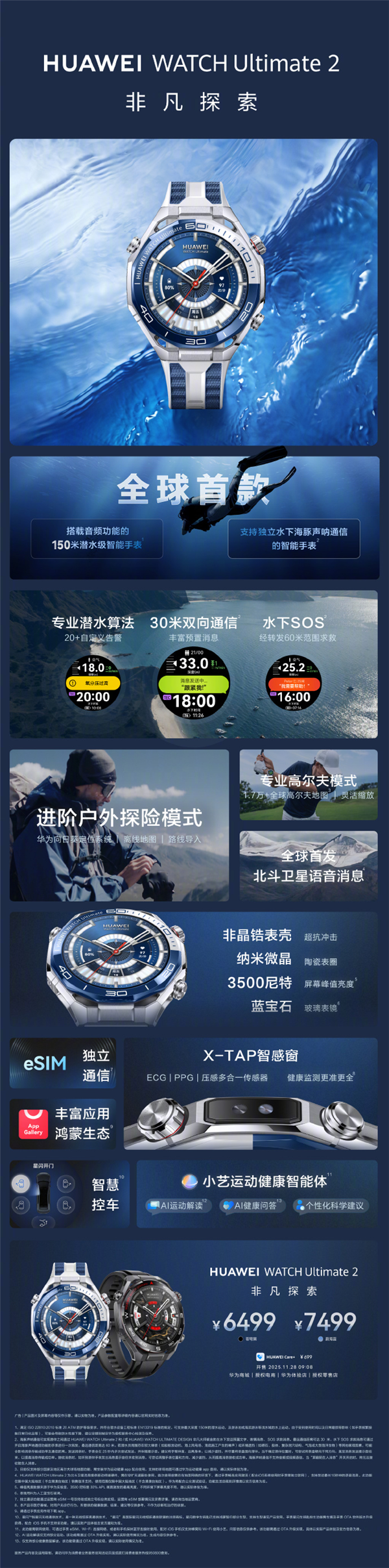 这款手表拥有多个“全球首发”:既是全球首款搭载音频功能的150米潜水级智能手表,也是全球首款支持独立水下海脉声通信的智能手表。