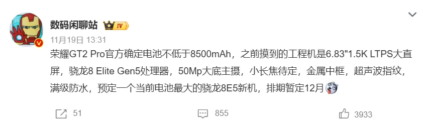 - 预算 3500 元以上:选荣耀 GT 2 Pro(8500mAh + 第五代骁龙 8 至尊版),旗舰级体验。