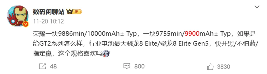 荣耀 GT 2 早就入网了,配置爆料得差不多了,最让人期待的就是它的电池 —— 最早说 9000mAh 起步,近期有博主说可能冲到 9900mAh,几乎要破万了!关键是还支持 100W 快充,这么大的电池,充电速度也没落下,再也不用为 “大电池充得慢” 发愁。