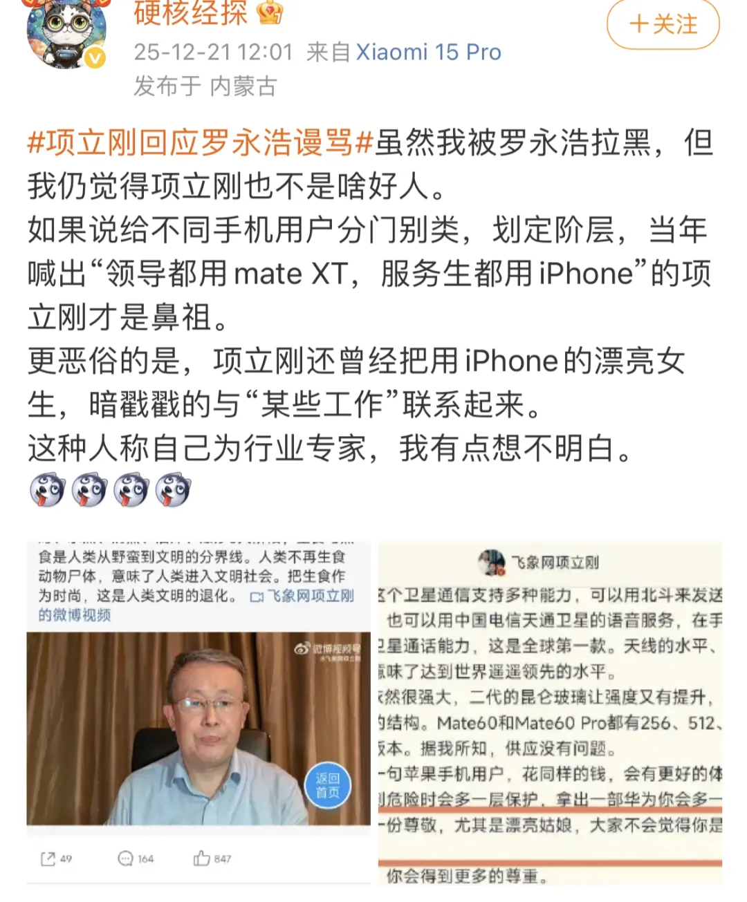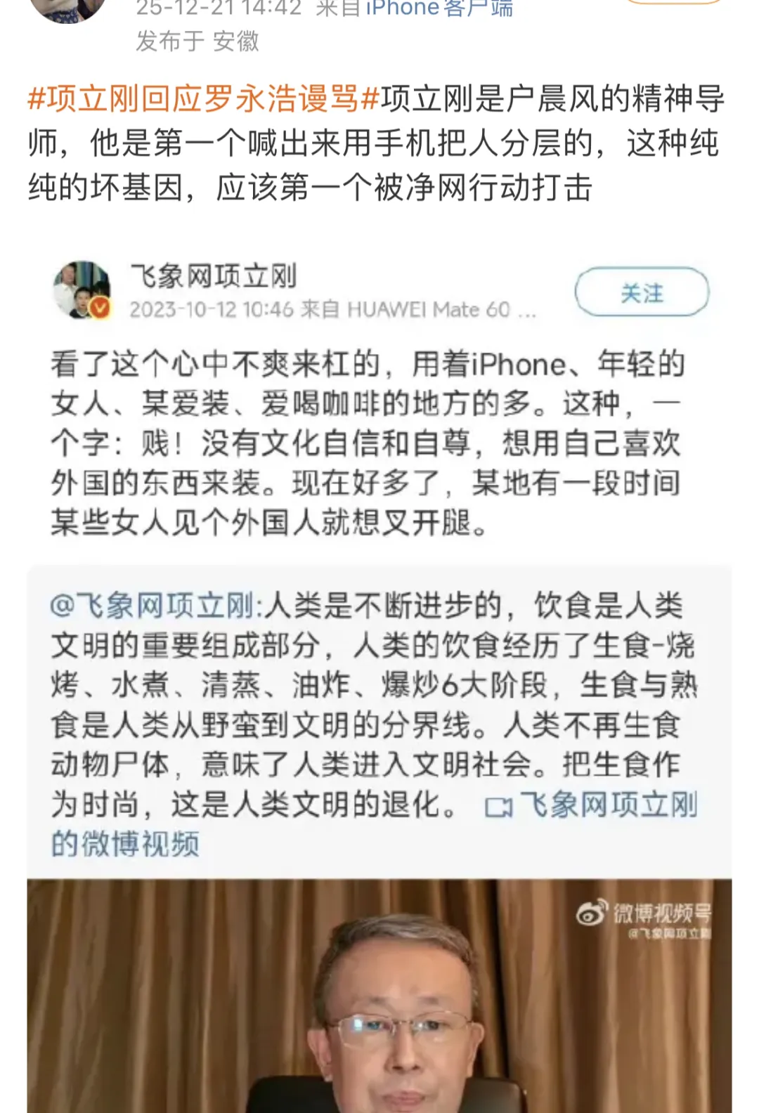 更有声音翻出项立刚过往争议言论,对其“行业专家”身份提出强烈质疑。例如,他曾多次在公开场合以手机品牌划分人群阶层,甚至暗示“使用某品牌手机的女性从事特殊职业”,此类言论被批评为带有明显的地域偏见、性别歧视与消费鄙视链思维。