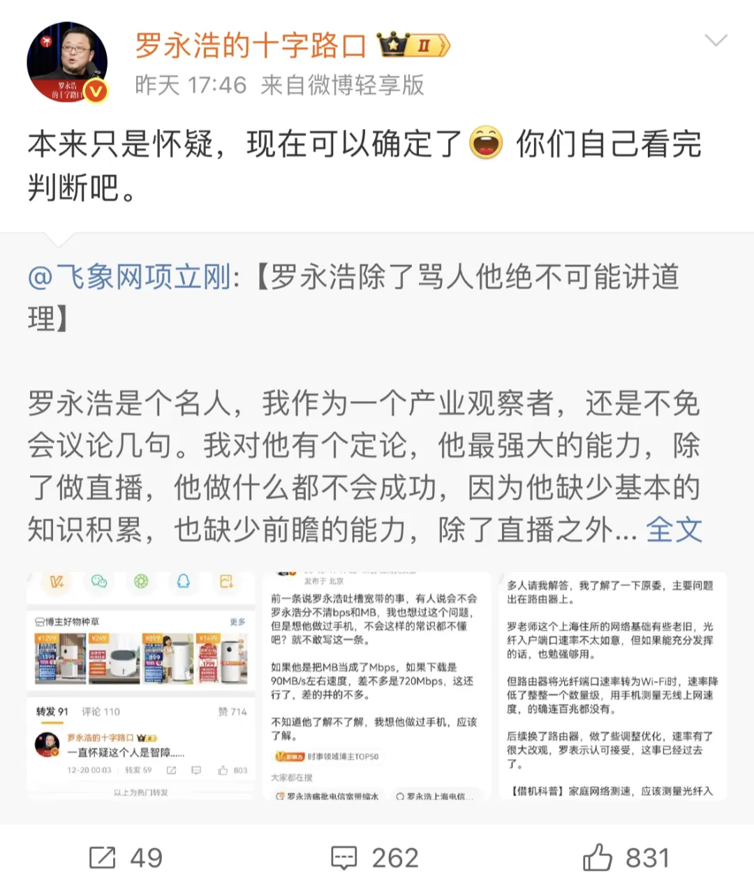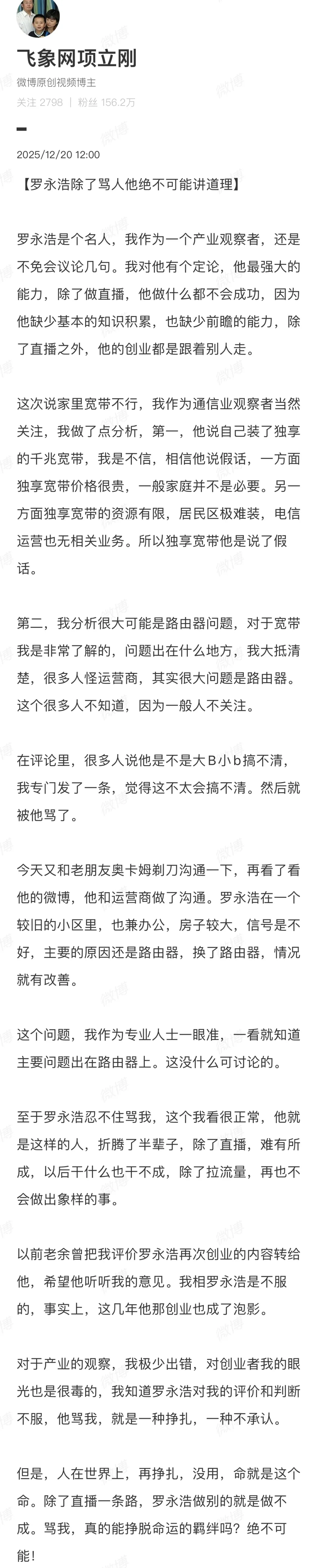他在文中直言:“我对罗永浩有个定论:他最强大的能力,除了做直播,做什么都不会成功。因为他缺少基本的知识积累,也缺乏前瞻思维,所有创业项目都是跟风模仿。”