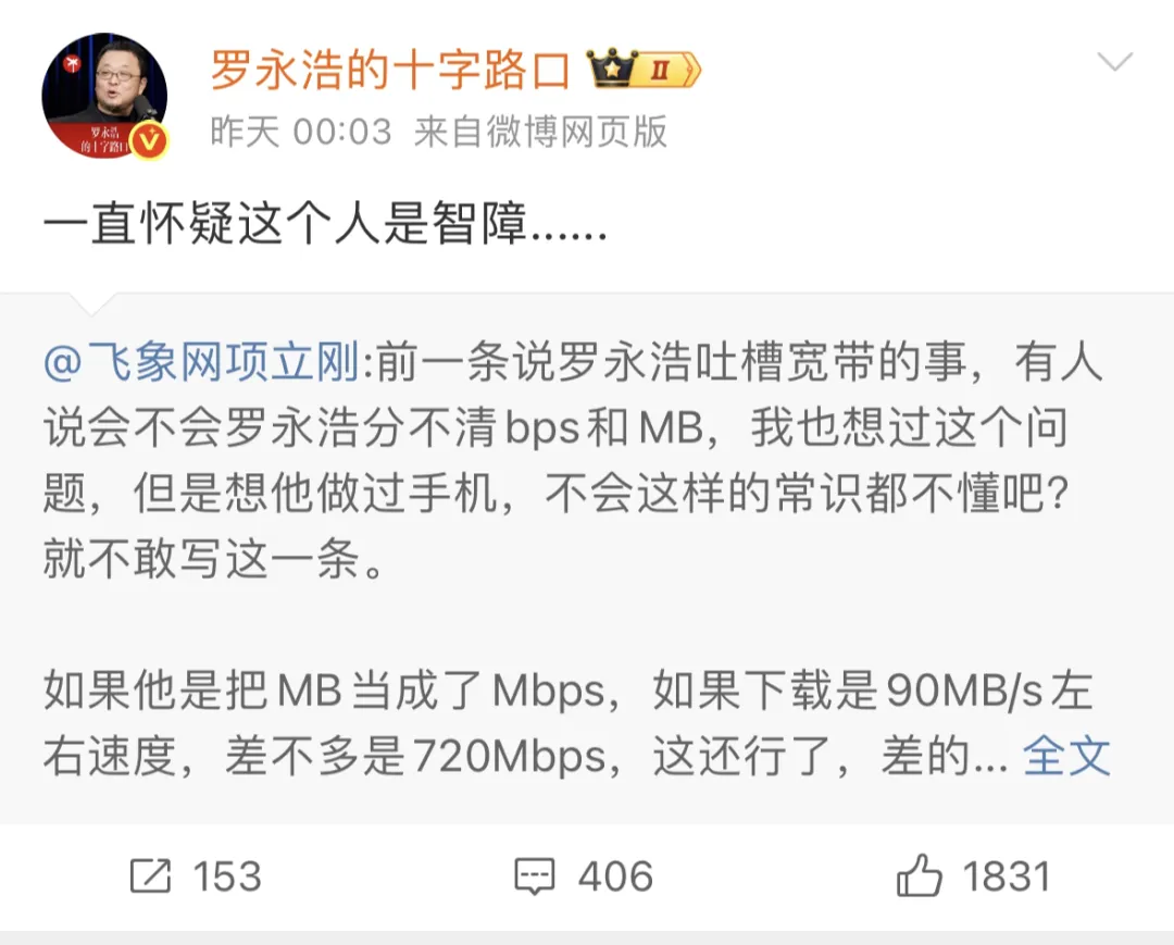 一方面,公众人物在表达不满时,是否应承担更高标准的技术严谨性?罗永浩的“百兆”表述虽不够精确,但在日常语境中普遍被理解为“网速慢”,未必构成认知错误。