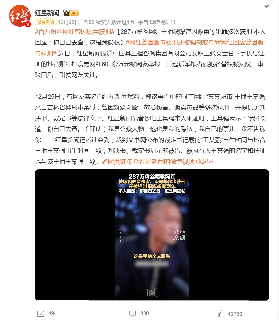 事件看似突发,实则早有伏笔。据红星新闻12月26日报道,该主播实名王某强(吉林省桦甸市人)曾多次因严重刑事犯罪被判刑,包括聚众斗殴、故意伤害,甚至涉及毒品犯罪。这些信息并非网络谣言,而是有中国裁判文书网公开的判决书、裁定书为证,且其姓名、出生年份、户籍地址均与抖音认证信息高度吻合。