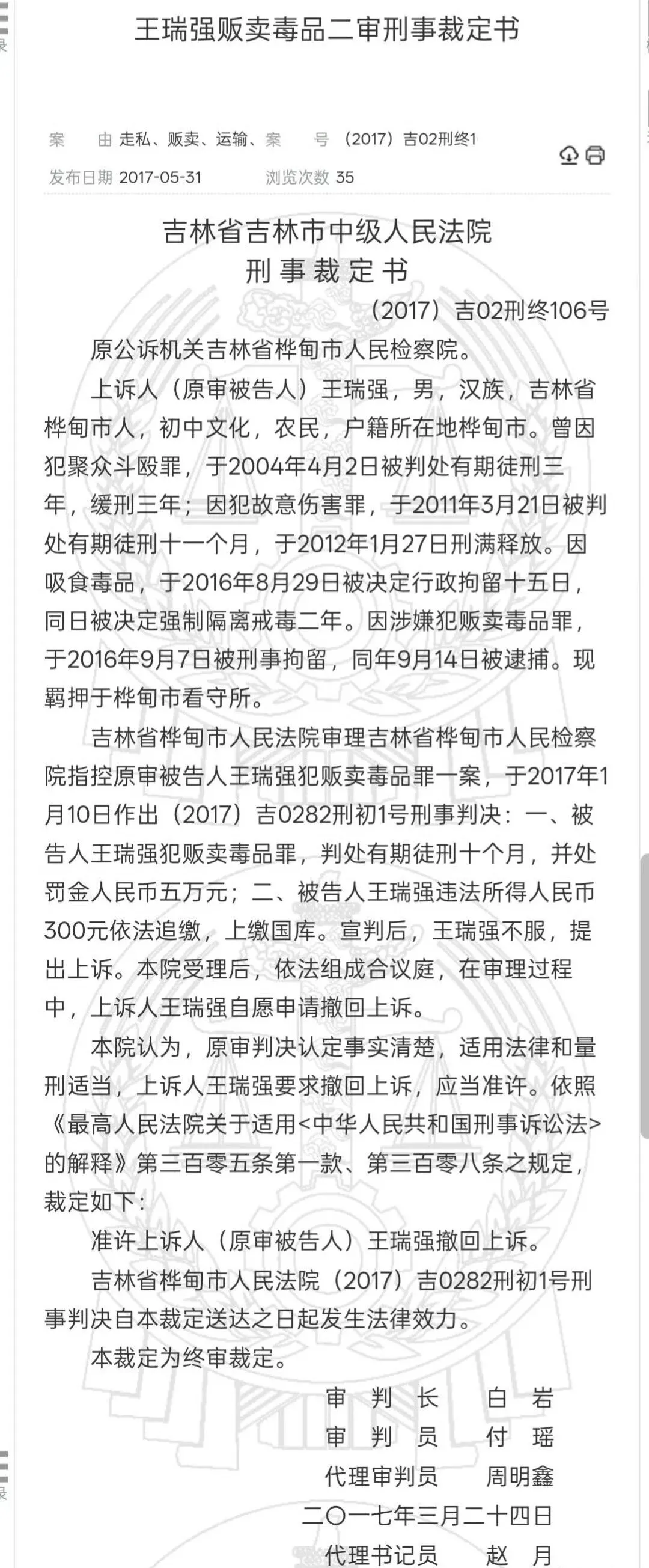 – 2017年,更因贩卖毒品罪被判处有期徒刑10个月,并处罚金5万元。