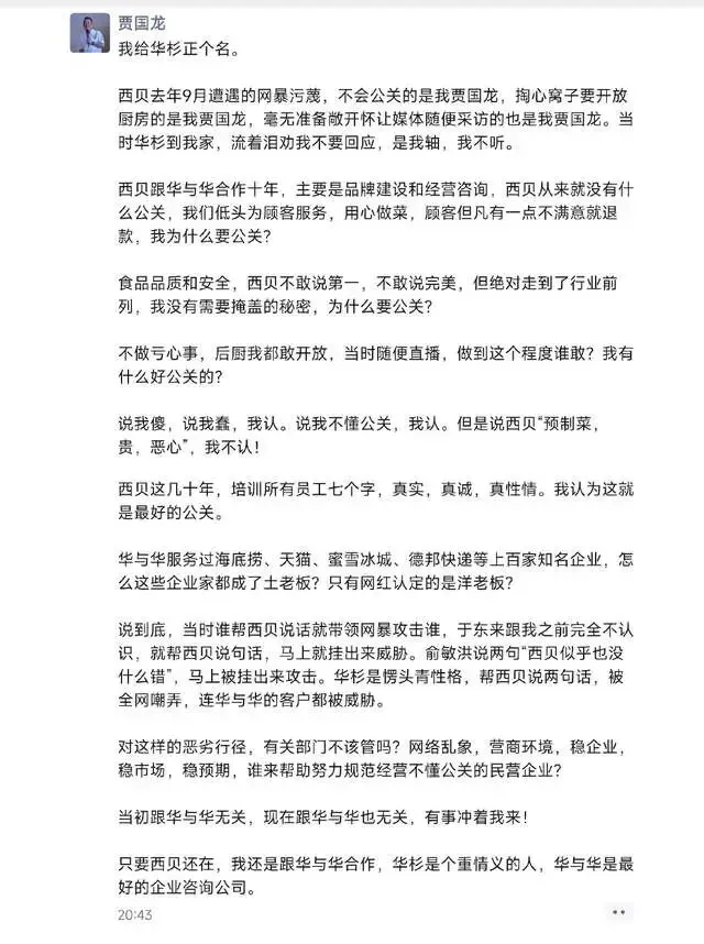 最近,西贝创始人贾国龙在朋友圈连发长文,