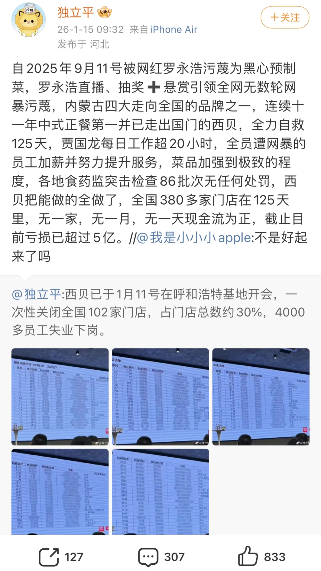 在罗永浩发声后的几个月里,西贝380家门店,没有一家、没有一月、没有一天现金流为正。
