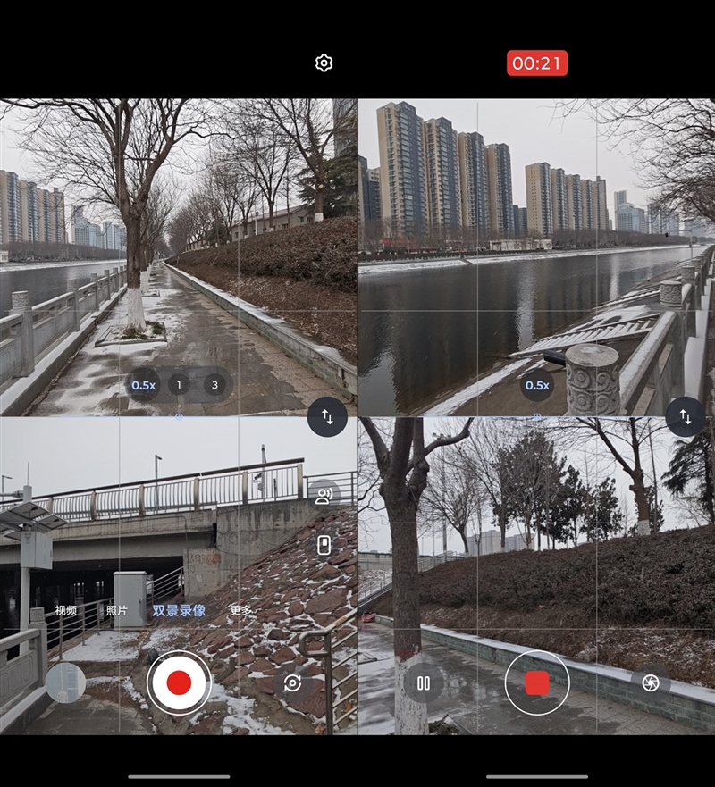 在相机的更多模式选择中,最后一个图标就是双景录像功能,开始后用户可以同时使用前置和后置摄像头,进行同时拍摄录像,并且在布局选择中,也可以选择大小屏幕套嵌或上下等分屏幕。