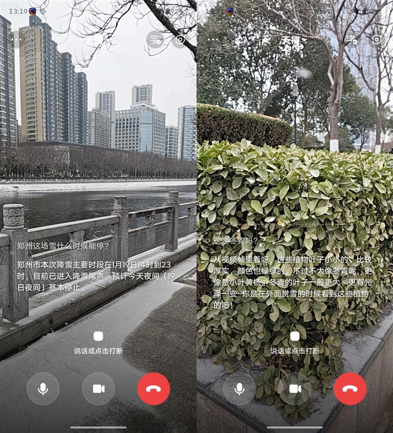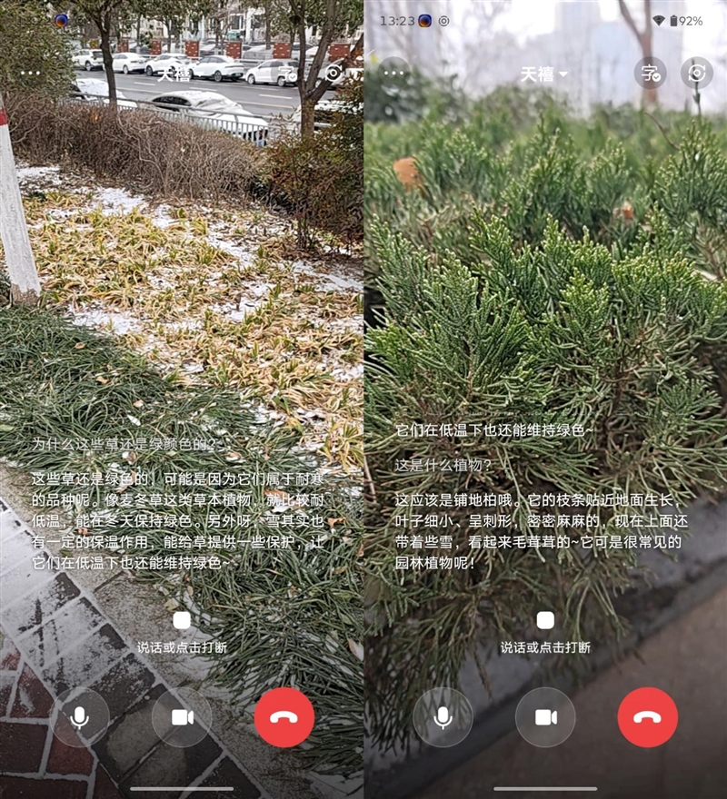 天禧AI的AI看世界功能,就像是打了一个视频电话,可以通过自然语言直接向天禧AI提问,它会根据问题并结合当前所拍摄到的画面,进行联网检索分析,从天气预报到识别植物,都可以顺利理解语义并准确回答。