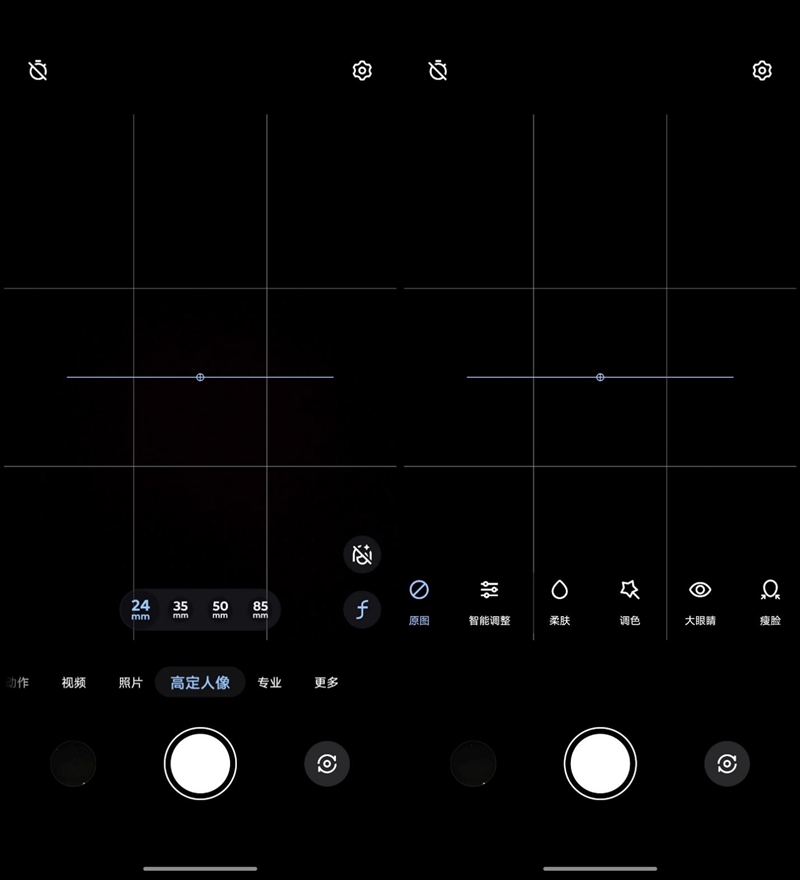 在高定人像模式中,镜头焦距会直接标出毫米数字,更方便用户理解使用,可以一键选择更适合特写的85mm黄金人像焦距或者35mm人文焦距。另外在高定人像模式中,还提供了丰富的美颜滤镜调节选项,但默认是关闭美颜的原图,有这方面需要的用户可以手动启用。