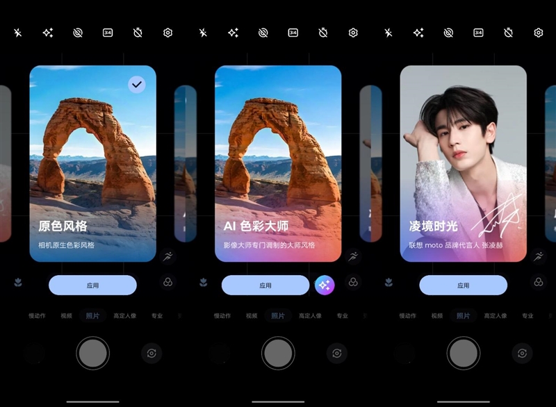 在拍摄界面,最上方一排快捷按钮中,第二个按钮是AI私人格调影像入口,可以选择不同的色彩风格,除了默认的原色风格之外,联想moto X70 Air Pro还提供了AI色彩大师和联想moto品牌代言人张凌赫的凌境时光。