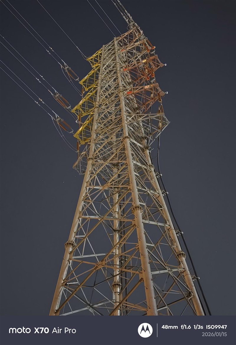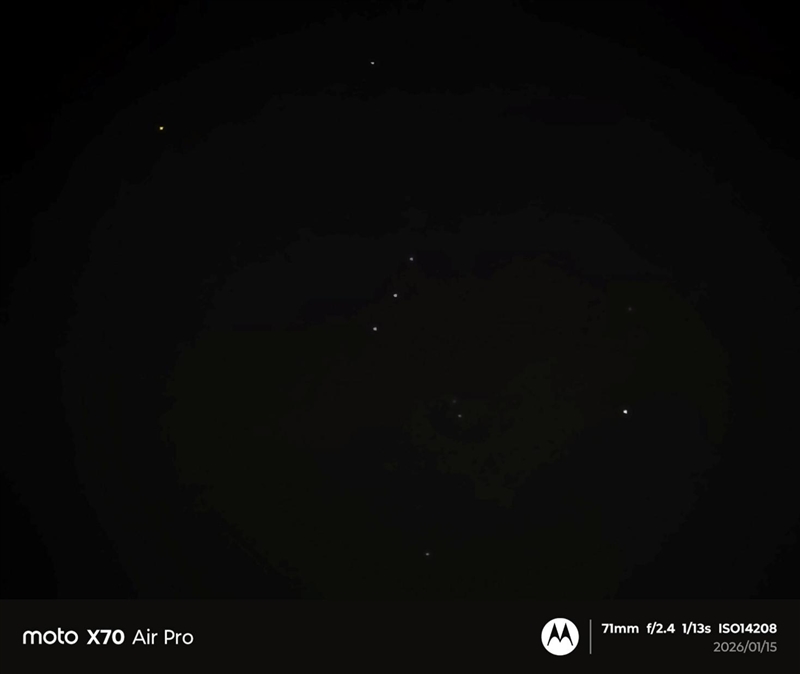 晚上测试夜景时,碰到了难得的晴朗夜空,我们也顺手试了一下,联想moto X70 Air Pro可以清晰的拍到冬季星空最具辨识度的猎户星座,效果令人惊喜。