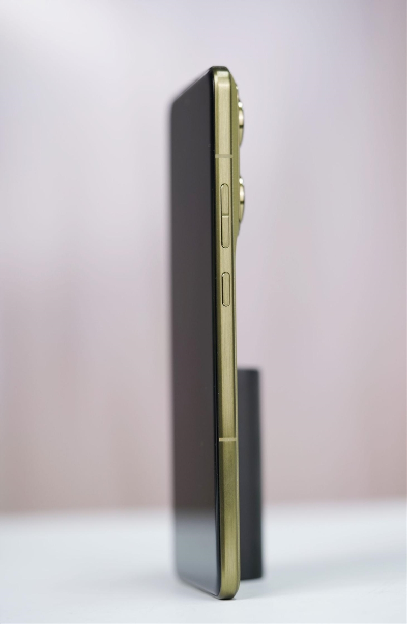联想moto X70 Air Pro的机身厚度仅有6.99mm,十分纤薄,梧桐金色的航空铝合金边框表面进行了精细的拉丝处理,提升金属质感同时还不会留下指纹,机身右侧靠上位置时一组音量键,靠下一点还有一枚电源按钮。