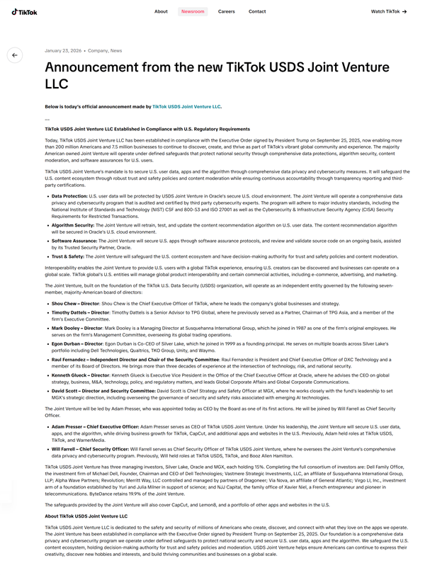 北京时间1月23日,TikTok发布公告称,已成立TikTok美国数据安全合资有限责任公司(TikTok USDS Joint Venture LLC)。