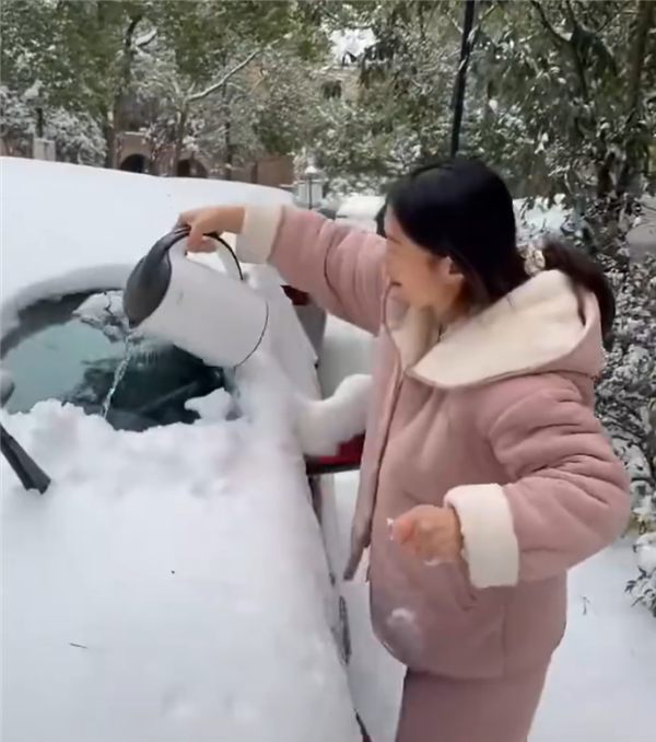 包小可1月22日消息,近期多地出现大雪天气,在外停放的车辆玻璃都会结冰。如果直接用热水浇车玻璃除冰,很可能会让玻璃炸裂。但有一位女子不信邪,找实车实验了一番。