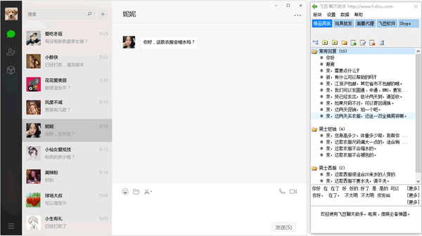 通过事先在飞豆聊天助手里编辑好经常需用到的语句,图片或文档等文件,点击字段前方的箭头即发送出去,以前同时接待3个客户比较吃力,有了飞豆聊天助手可以轻松接待10个客户以上。