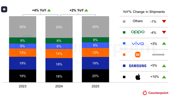 就比如今年的智能手机全球出货量,苹果靠着 iPhone17 系列的牙膏挤爆,居然把三星连续十几年的霸榜给终结了;国内市场这边,华为时隔五年拿下出货量第一。总之有点赛博斗蛐蛐的意思了。。。