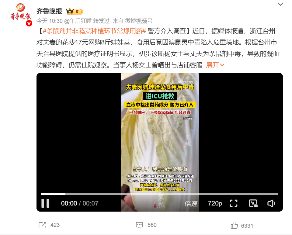 医院后续确诊,二人系重度溴鼠灵(杀鼠剂的主要成分)中毒,这种毒物会直接破坏人体凝血功能,引发全身自发性出血,致死风险极高。而更令人疑惑的是,夫妻二人日常几乎无接触老鼠药的途径,家中所有物品也逐一排查,未发现任何杀鼠剂相关痕迹,所有疑点最终都指向了中毒前食用的网购娃娃菜。