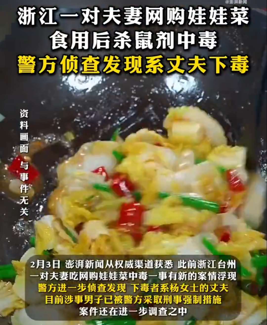 就在事件逐渐平息、大众仍在讨论生鲜包装规范时,2 月 3 日澎湃新闻从权威渠道获悉,该案件有了突破性进展:台州警方经进一步侦查,确认投毒者正是杨女士的丈夫,目前该男子已被采取刑事强制措施,案件仍在进一步侦办中。