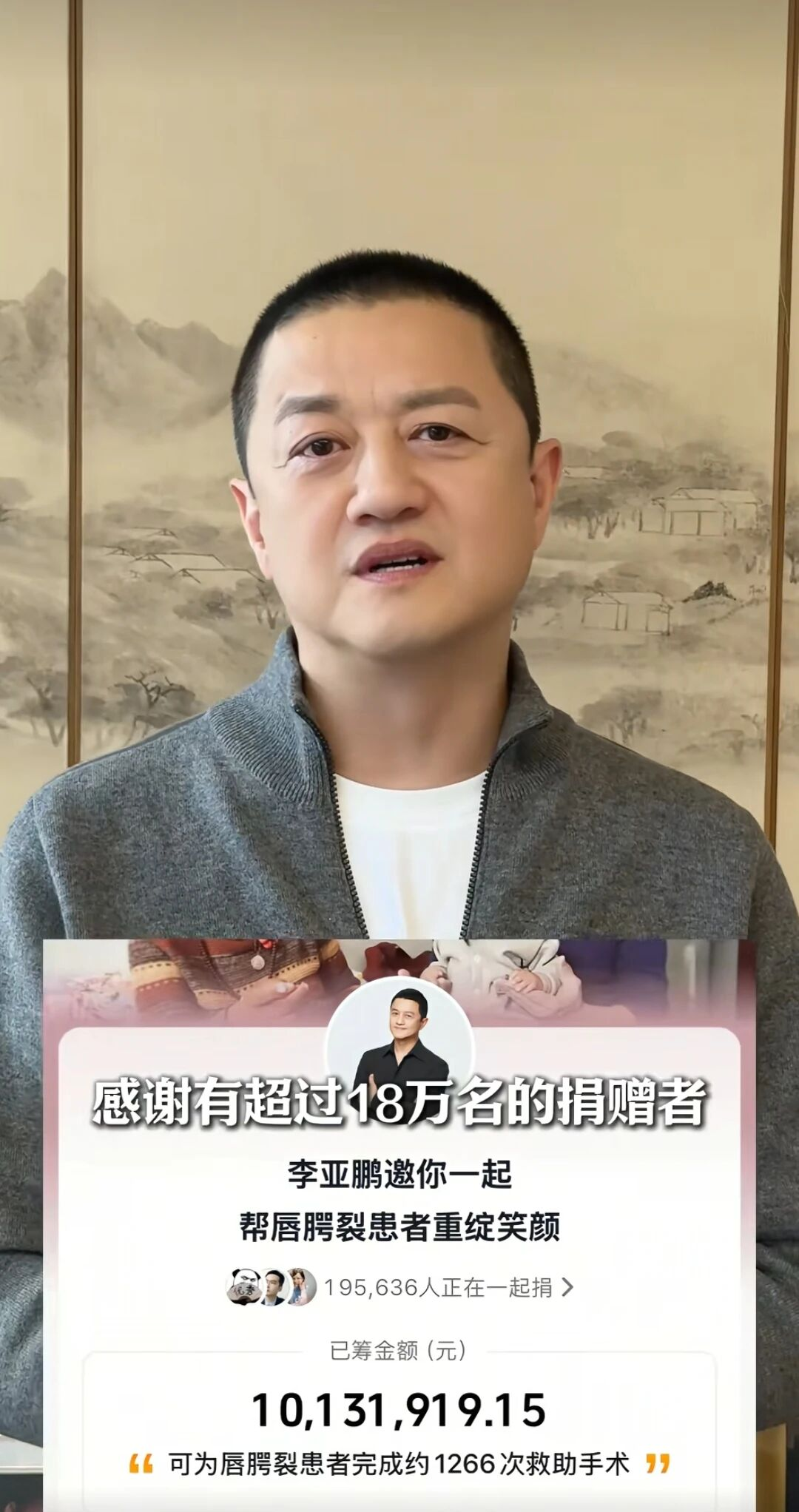 2月4日,嫣然天使儿童医院第15周年年会上,李亚鹏站在台上,声音颤抖、眼眶泛红,只说了一句: