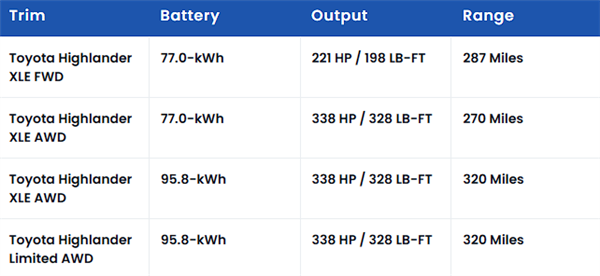 动力方面,电动版汉兰达分为XLE和Limited两款配置,前者包含三种版本,其中入门的XLE配前置单电机,最大可输出221马力,搭载77千瓦时电池组,续航约287英里(约461.9公里)。