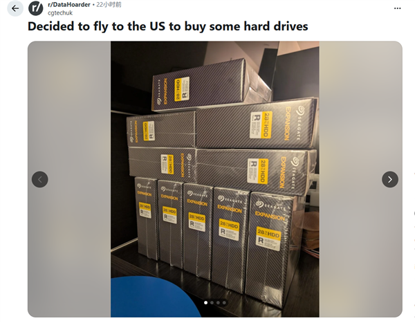 Reddit论坛版块用户u/cgtechuk分享了这段经历。他长期关注英国28TB大容量硬盘价格,发现其持续攀升、只涨不跌,始终找不到合适入手时机,最终决定新年后专程赴美,一次性采购10块该规格硬盘。