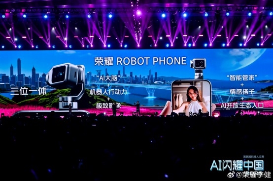 除常规手机产品外,荣耀还展示了一款名为Robot Phone的概念机型。该产品机身内置隐藏式可折叠机械臂云台,支持快速展开与360°无级旋转,并可与端侧大模型YOYO协同工作,实现自动构图、目标跟踪等功能。