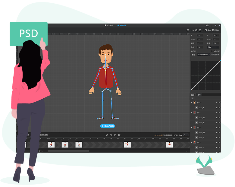 添加骨骼到图片后,可以控制骨骼让角色移动、任意角度旋转。其中曲线骨骼可以让角色的曲线变化更加圆滑流畅,从而让动画角色整体效果达到最佳。