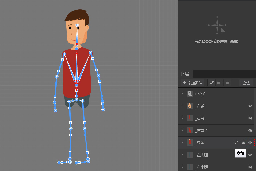进入添加骨架操作界面,即可开始给角色图片添加骨头。假如是想要实现更顺滑的曲线运动效果,则可以选择添加曲线骨头。