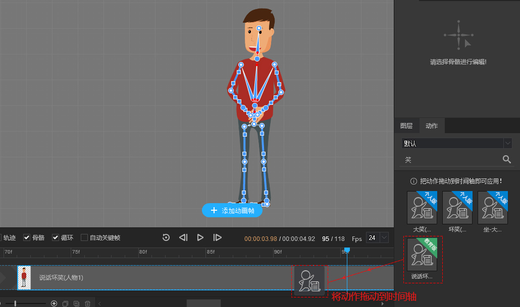 添加完骨头后,即可开始制作动画。拖动时间轴的播放头到所需的动画帧位置,调整角色动作(移动,旋转等),再【添加动画帧】。调整好的动作动画帧即可显示在时间轴中。