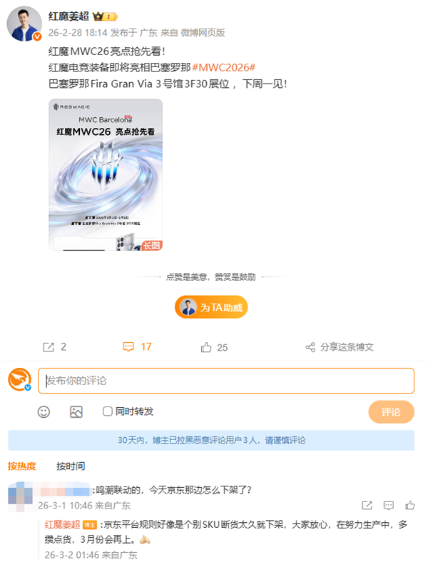 对此,红魔游戏手机产品总经理姜超表示:“京东平台规则好像是个别SKU断货太久就下架,大家放心,在努力生产中,多攒点货,3月份会再上。”