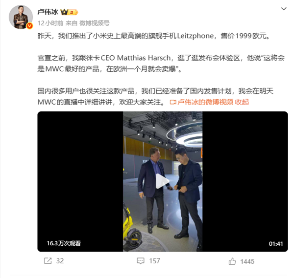 在新机官宣前,卢伟冰与徕卡CEO Matthias Harsch一起逛了发布会体验区,Matthias Harsch称,“这将会是MWC最好的产品,在欧洲一个月就会卖爆。”