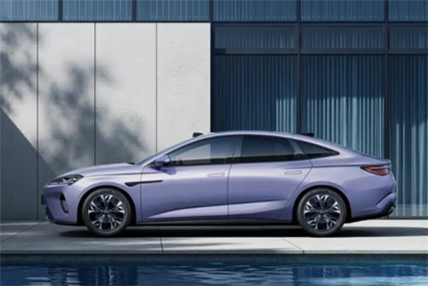 车身侧面线条从A柱平滑过渡至车尾,配备隐藏式门把手、低风阻轮毂与大尺寸全景天窗,车尾同样为溜背式设计。