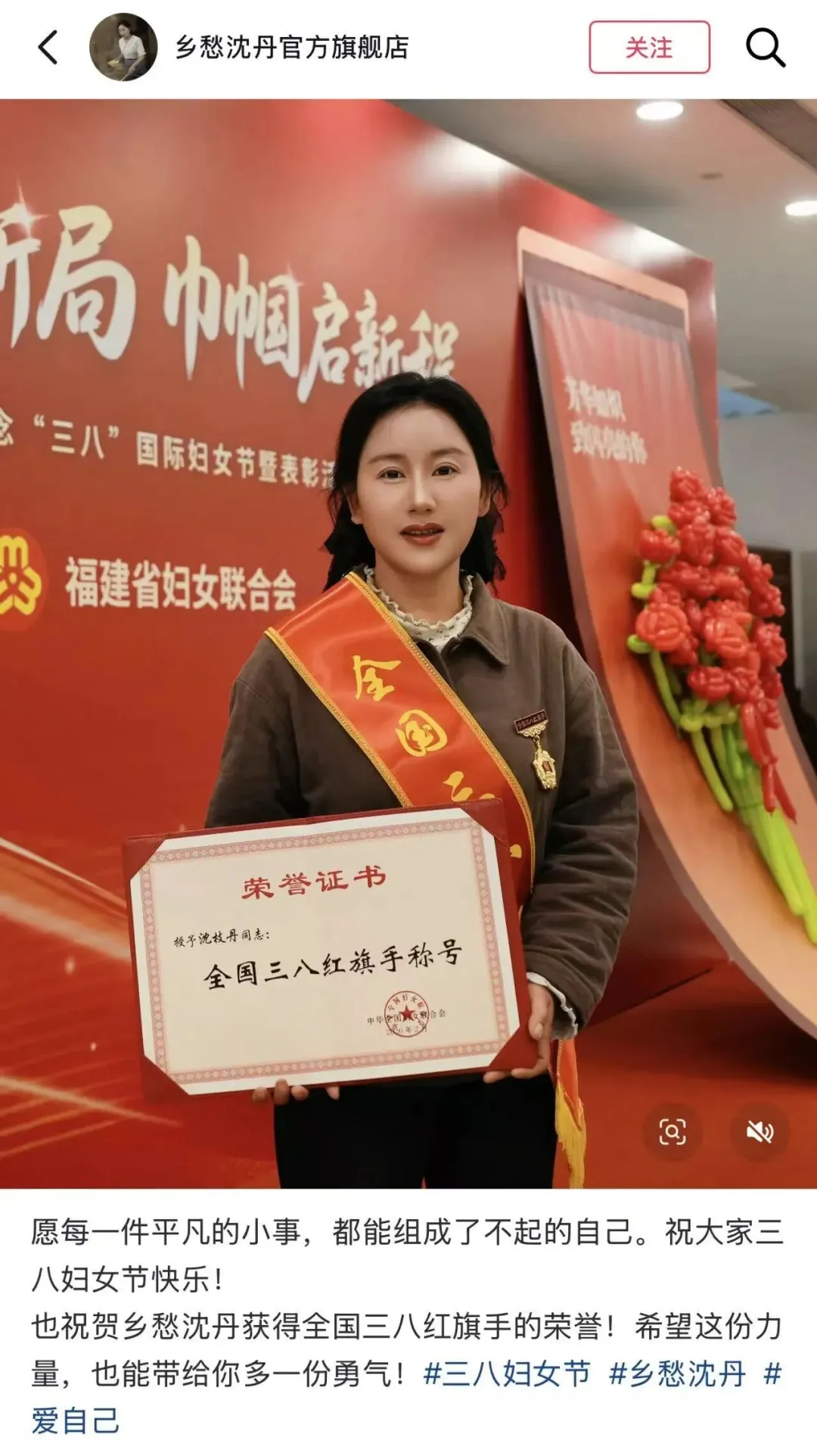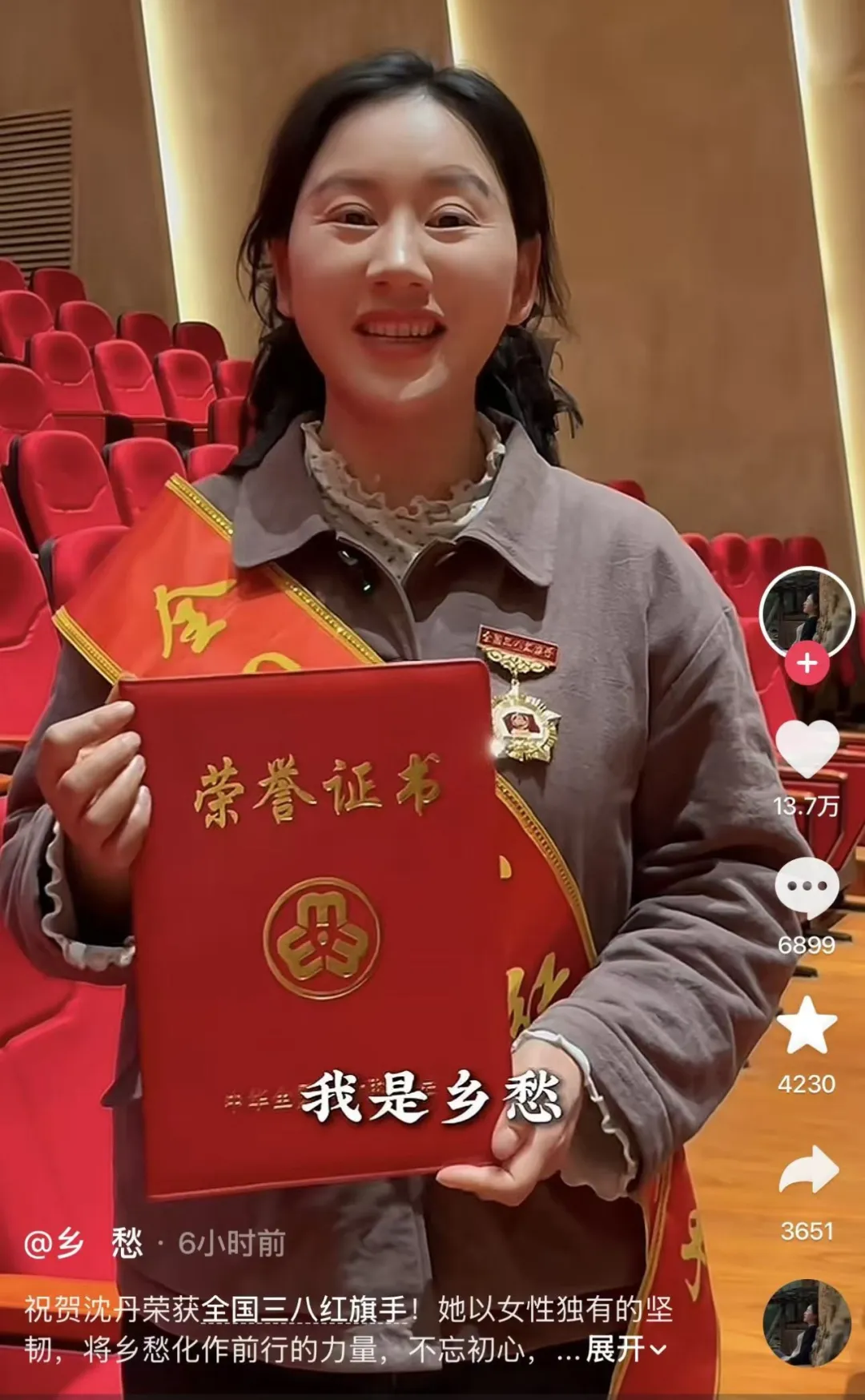 三八妇女节这天,一个网红的获奖消息刷爆全网,让网友集体刷屏点赞:坐拥 2370.6 万抖音粉丝的乡愁沈丹,拿下全国三八红旗手称号!这份国家级荣誉,不仅是对她个人的肯定,更是对她扎根乡村、带动乡亲致富的认可。