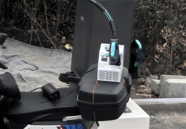 显然这辆车经过了改装,充电枪先是连接到了一个类似转接器的装置上,而后又经过车辆自带的充电器连接到电池,从而实现补能。