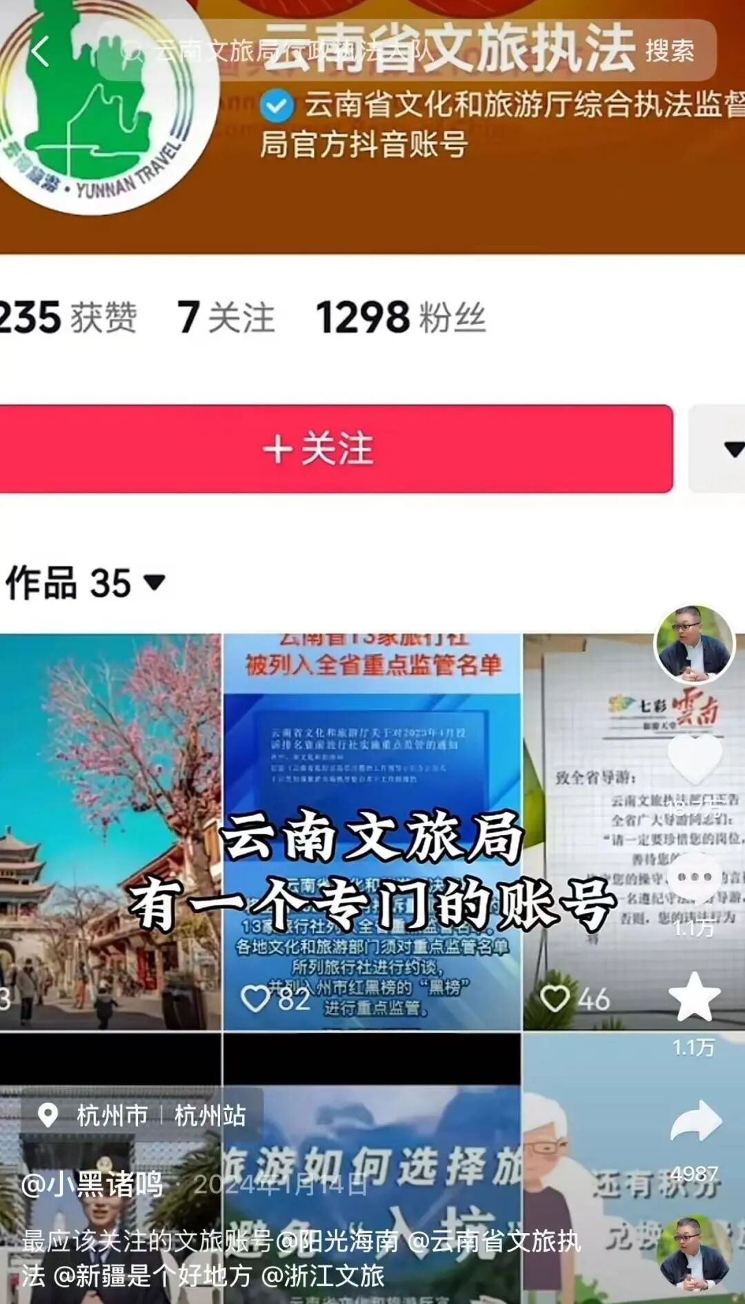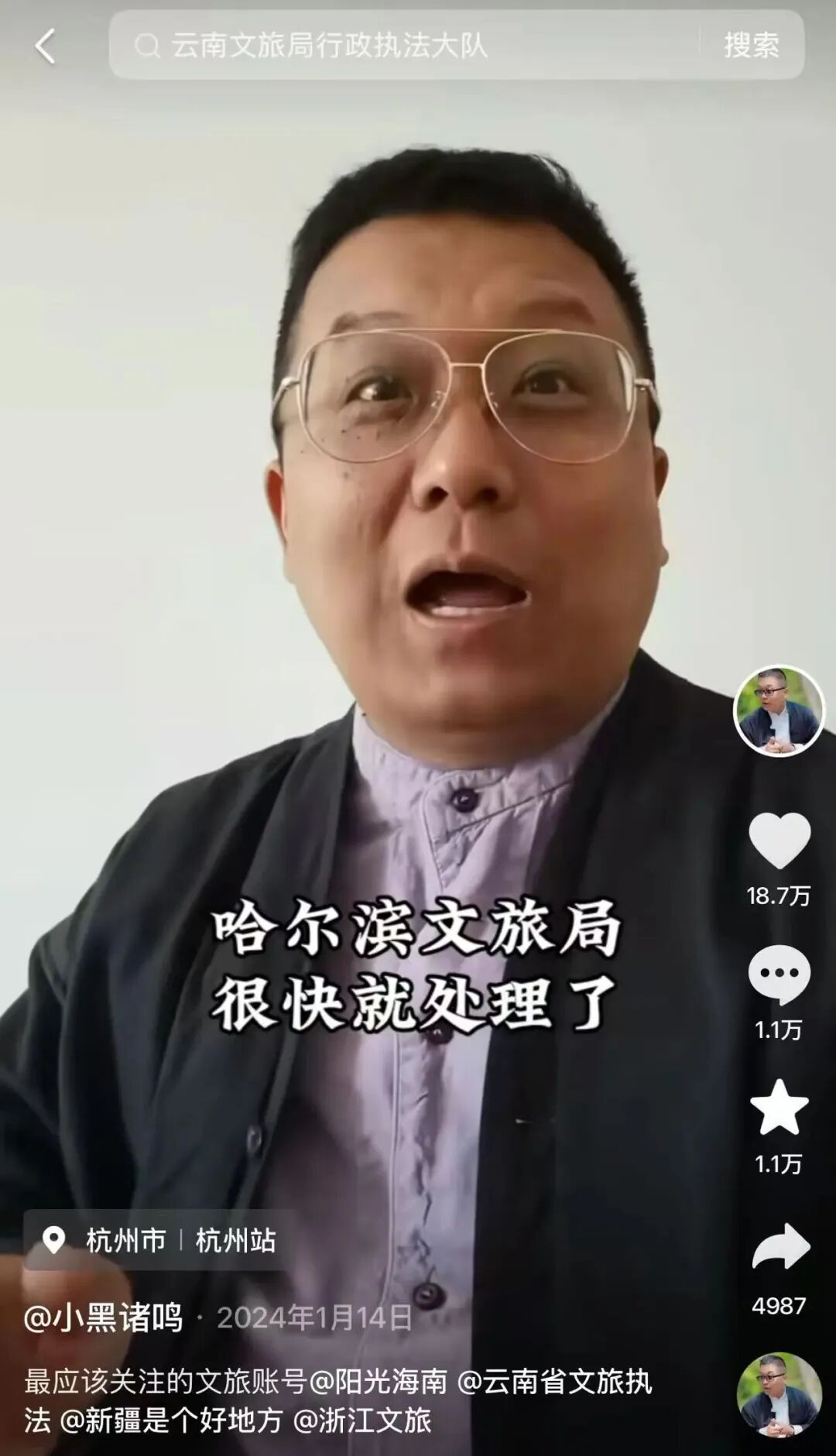 事情的起因要拉回 2024 年 1 月,彼时哈尔滨文旅因高效处理旅游乱象火遍全网,小黑诸鸣顺势发视频盘点最值得关注的文旅官方账号,点名海南、云南、新疆、浙江文旅,其中重点安利了云南文旅局行政执法大队。