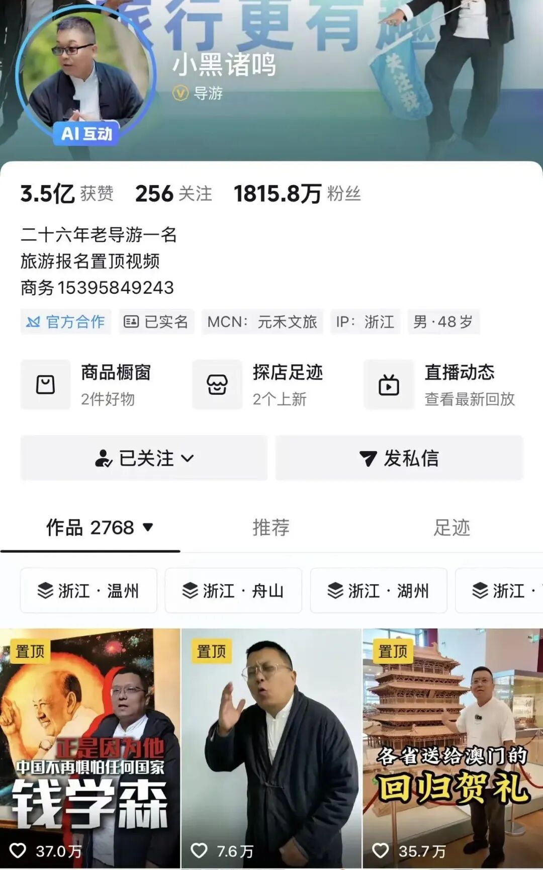 不靠疯狂直播带货,他的抖音橱窗仅售少量好物,核心业务还是线下带团,一个苏杭连线纯玩团单价 2399 元,已售 4000+,靠的就是 “纯玩无购物” 的口碑。签了 MCN 元禾文旅,还在原公司杭州百缘旅行社上班,有自己的工作室,他把 “导游” 这份职业做到了极致,也成了游客心中的 “旅游风向标”。