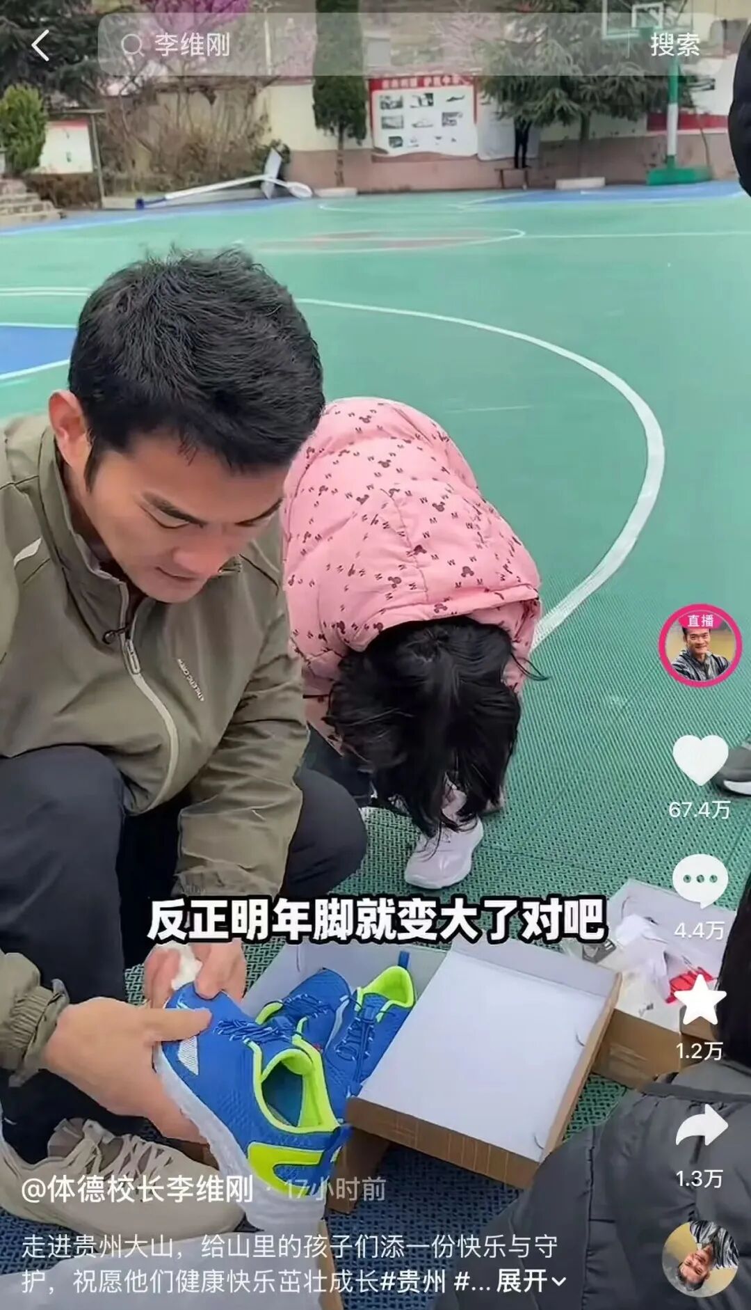 这次来贵州,李维刚没玩虚的,直奔主题:给孩子们修一个橡胶操场。从承诺到落地,他不仅全程参与,还趁着施工的间隙,带着孩子们去游乐场撒欢,请孩子们吃自助餐,甚至提前登记了每个孩子的鞋码,在操场快修好时,送上了崭新的运动鞋。看着孩子们穿着新鞋在新操场上奔跑的样子,很难不被这份温暖戳中。