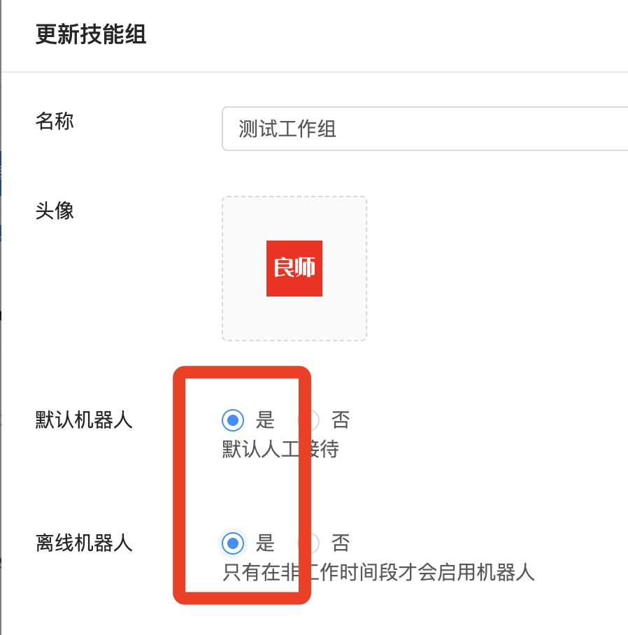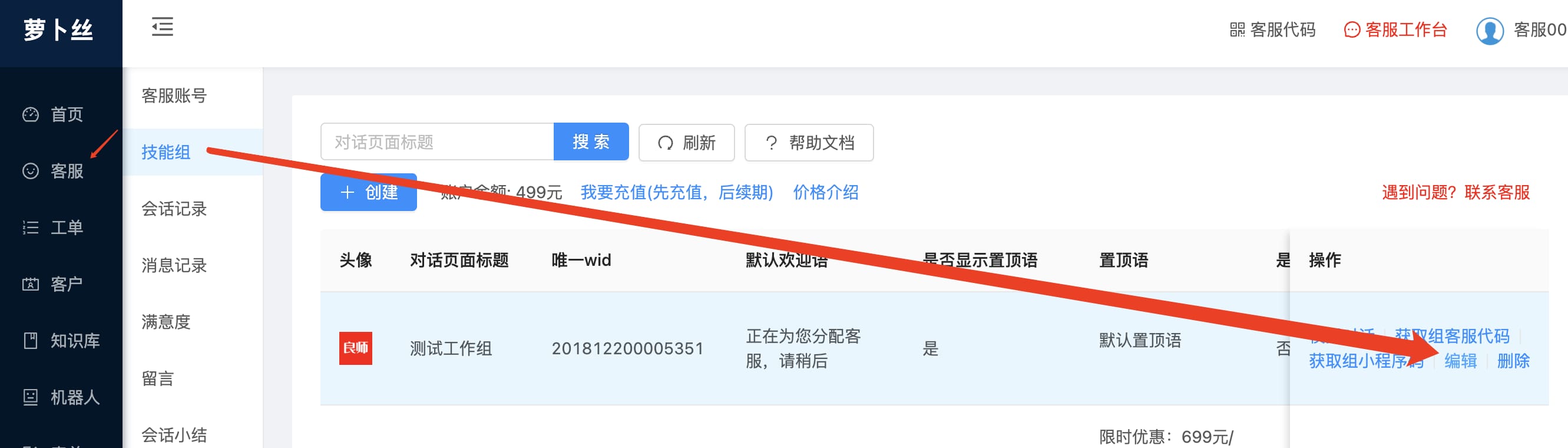 2. 在技能组开启机器人。 找到 “客服管理”-》技能组-》点击相应技能组“编辑”按钮