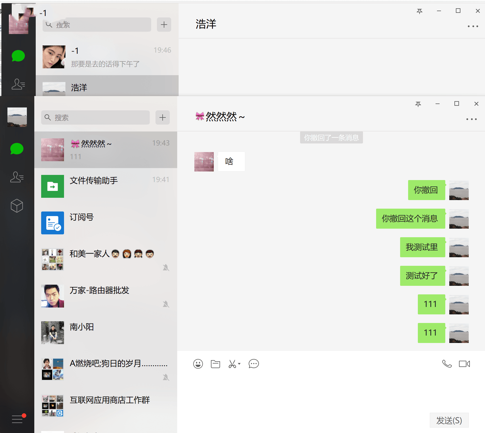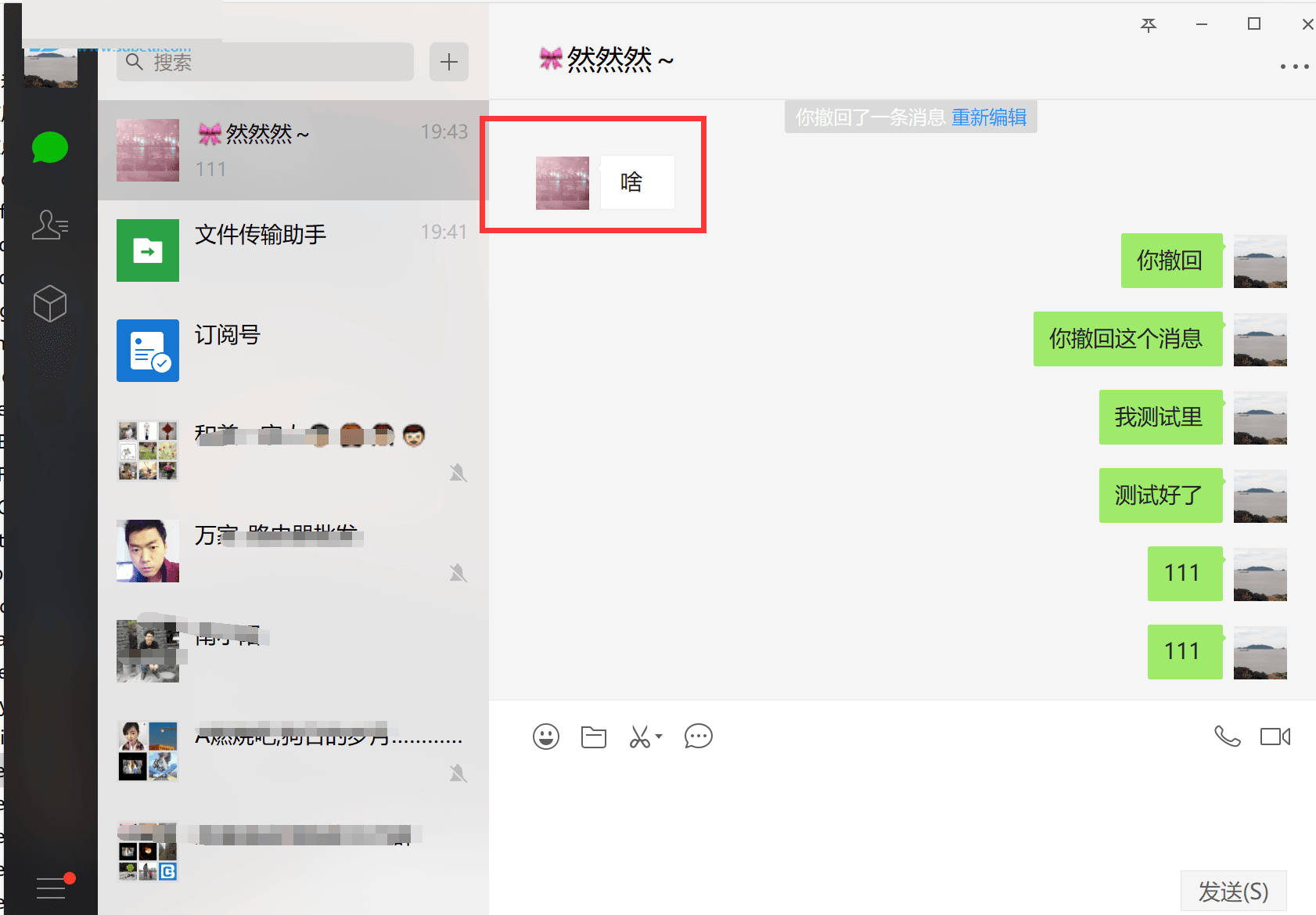 2.我们发一条消息,然后撤回,分别看下手机版和电脑版的变化