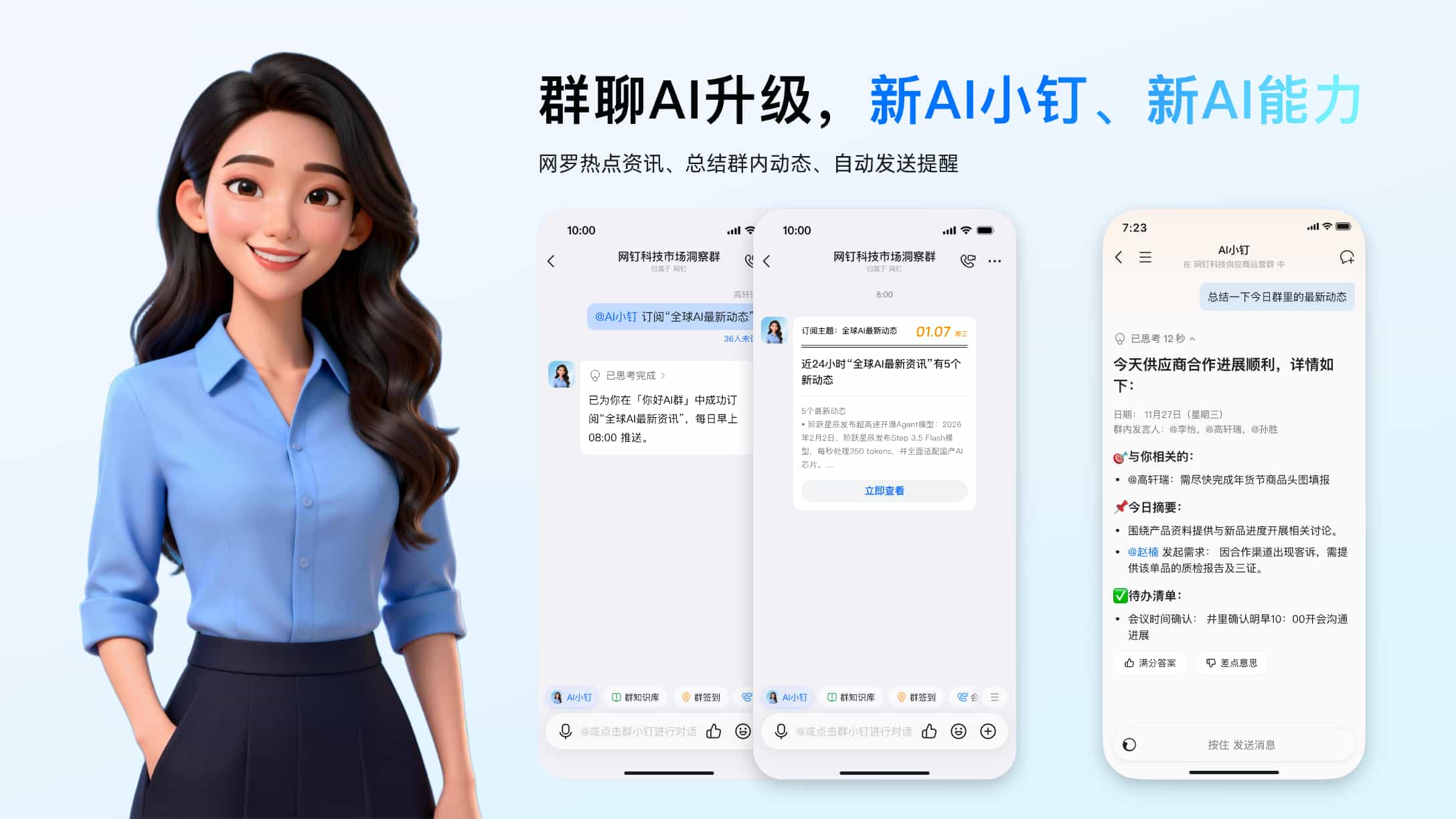 AI小钉帮你网罗热点资讯、总结群内动态、自动发送提醒