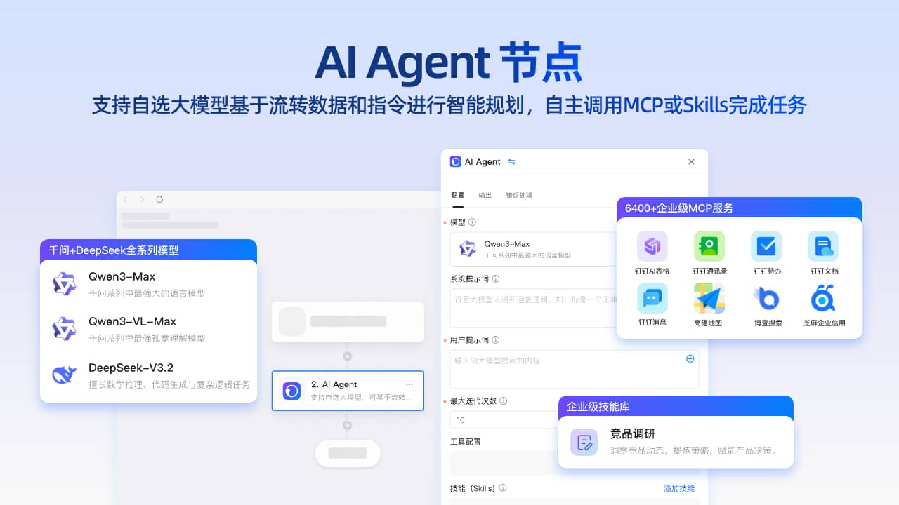可以通过AI Agent节点串联400+MCP服务以及Skills,拓展更多AI自动化场景