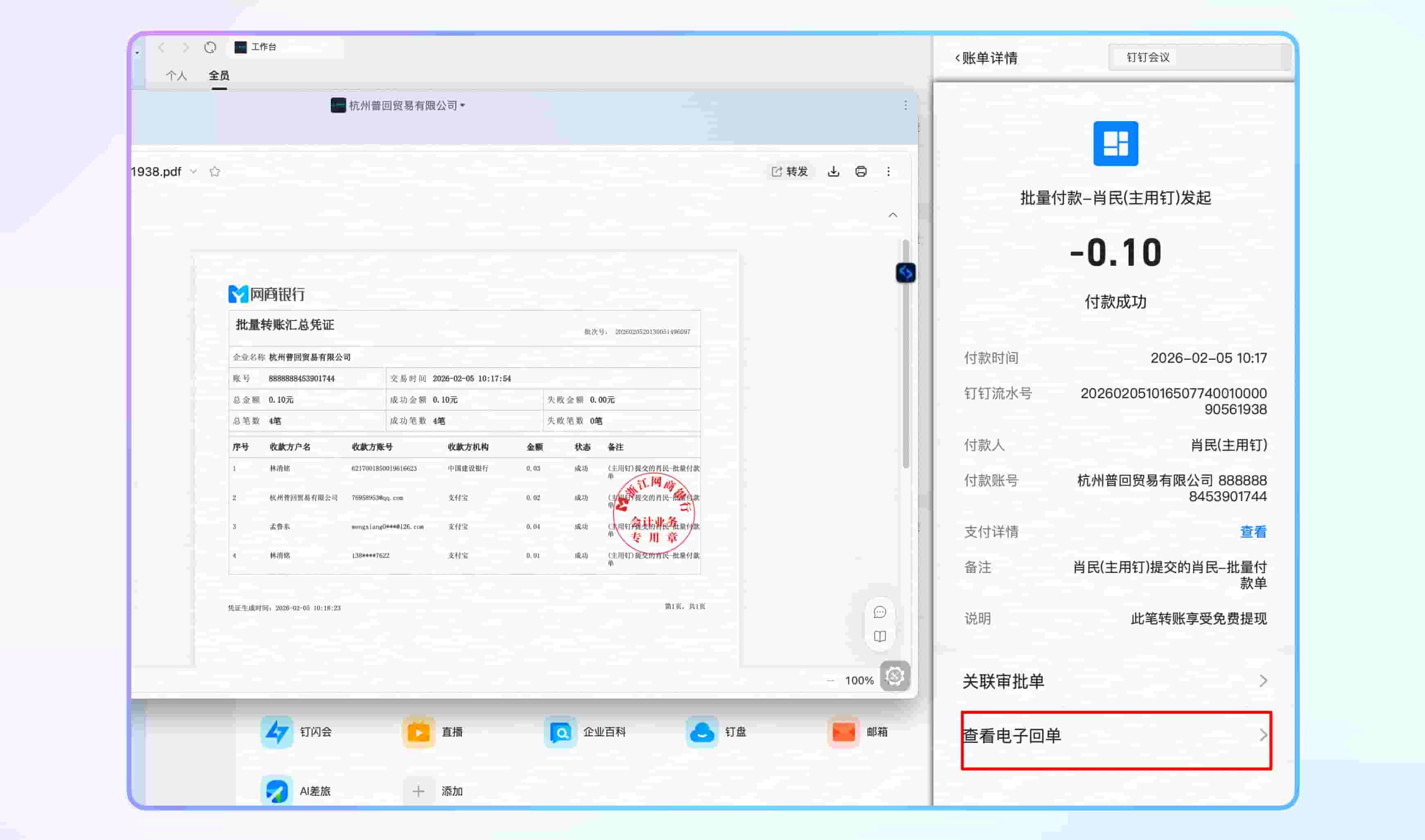 付款报销单审批完成并一键在线支付后,回单自动回传