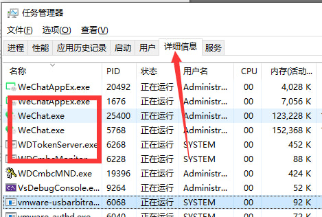 2、点击【详细信息】,找到微信进程WeChat.exe,点击任务管理器右下角的【结束任务】,全部结束WeChat.exe或逐个排除定位是哪个微信号没有界面。结束完后,重新登录微信号。